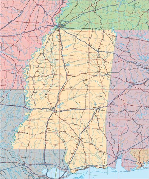 Detail view of EPS Vector Map of Mississippi - the land fill color is switched on.